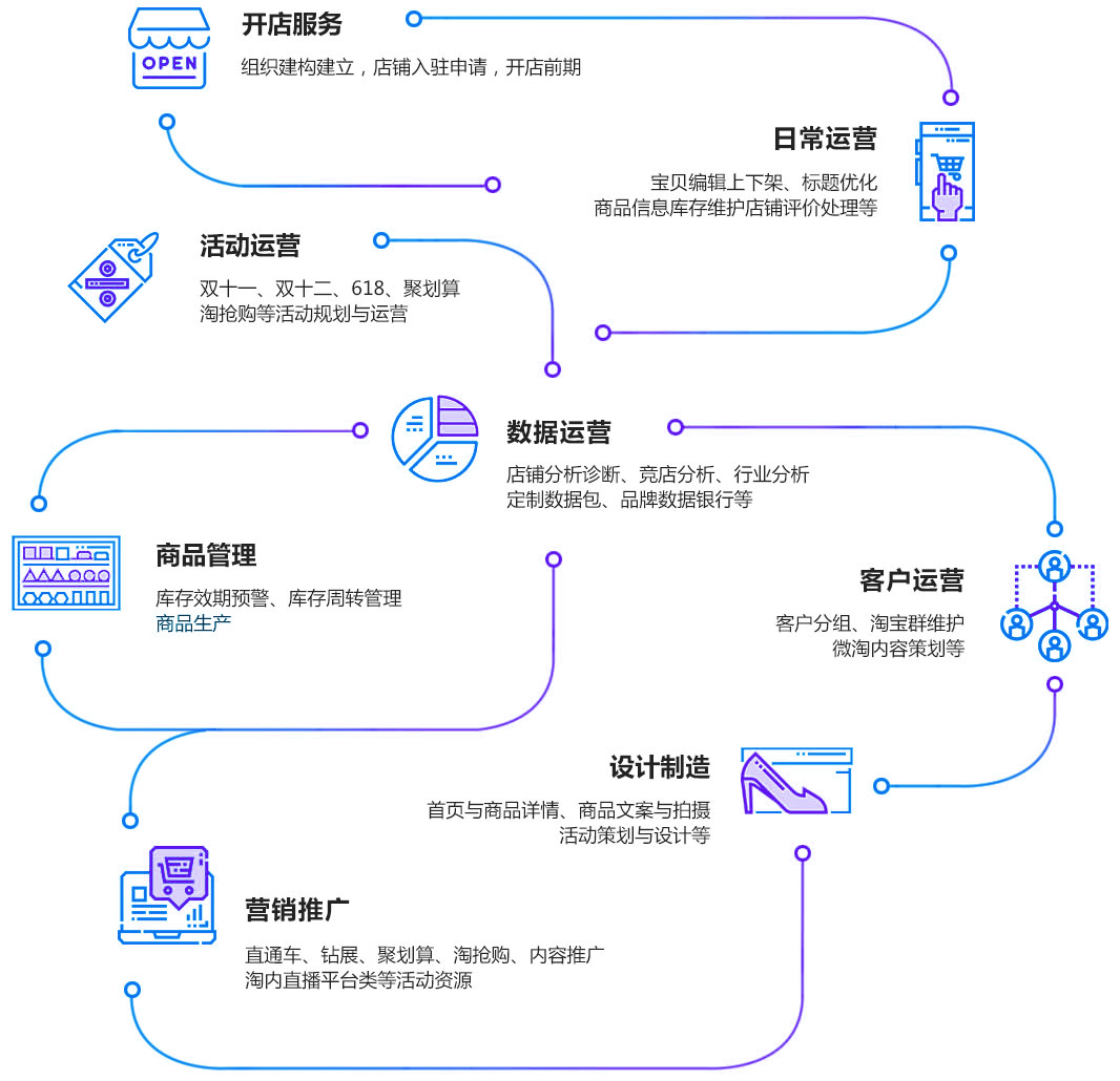 我們為企業提供全電商平臺的一站式代運營方案,深入企業開展電商的每一個環節